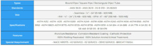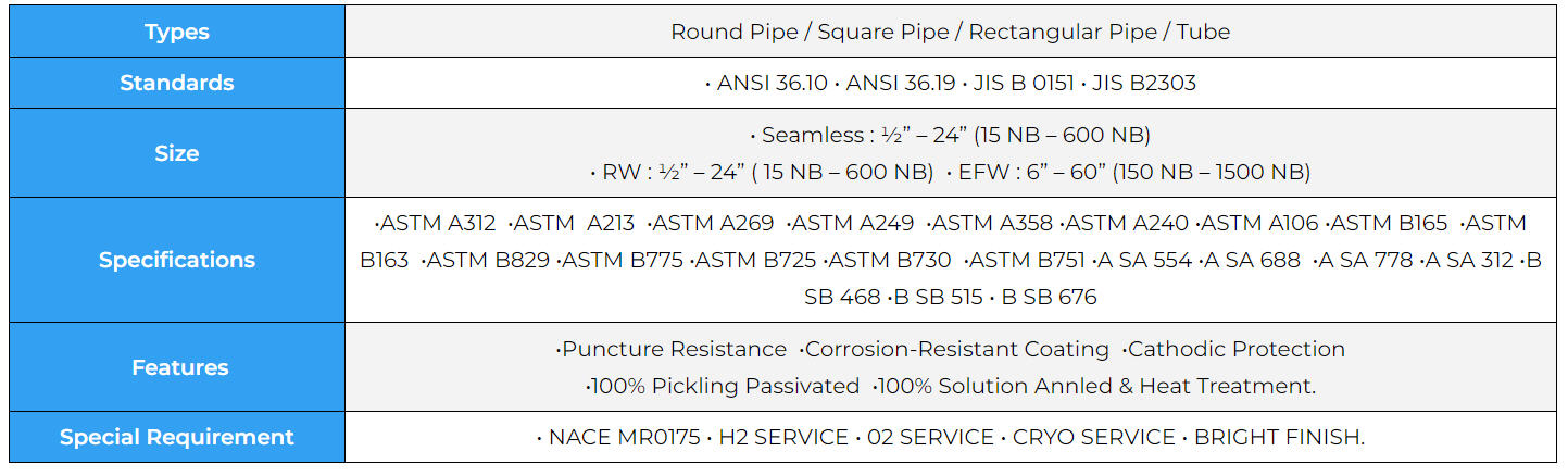 | Pipe Manuf. Process | Seamless Pipes , Welded ERW/EFW/HFW Pipes |